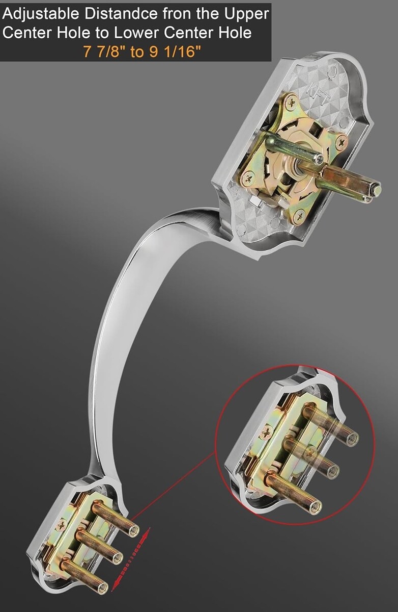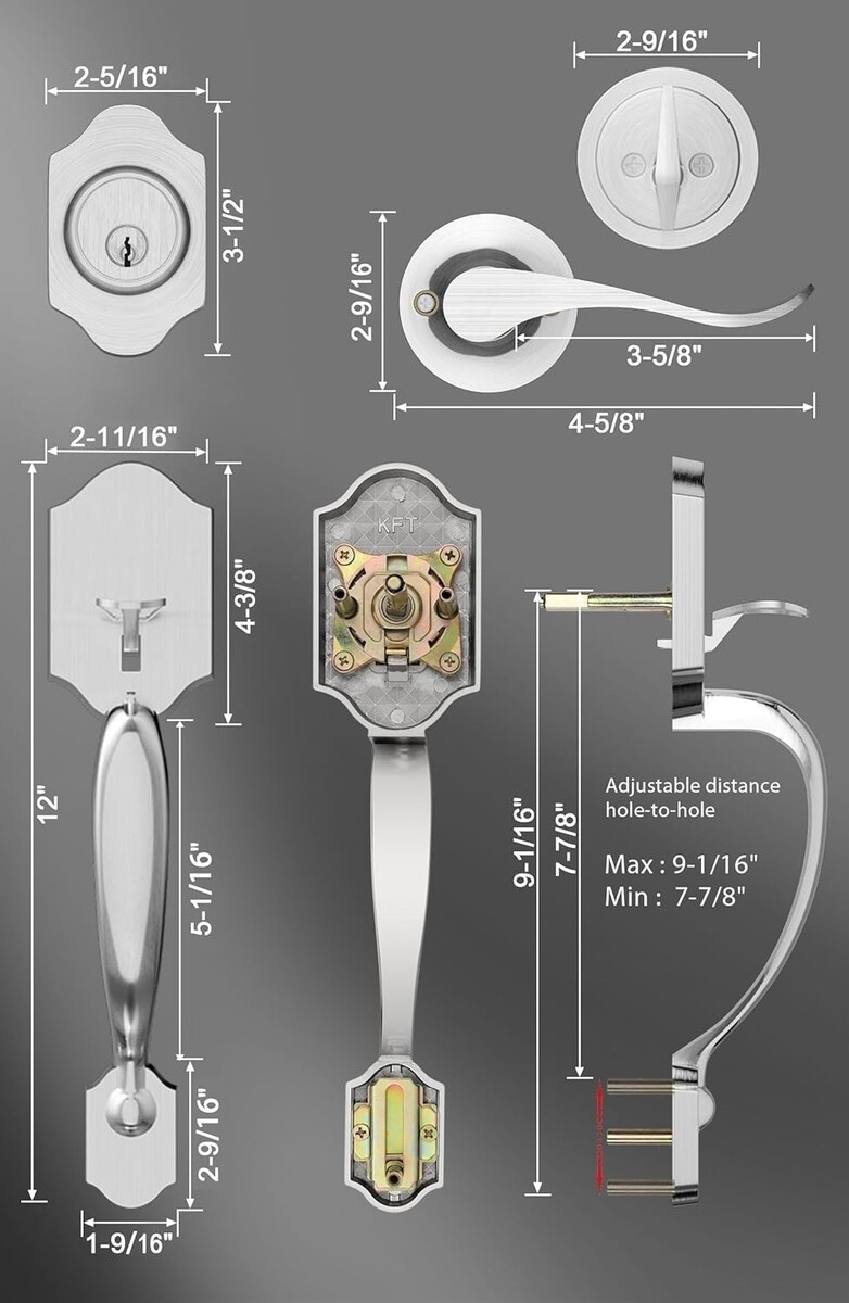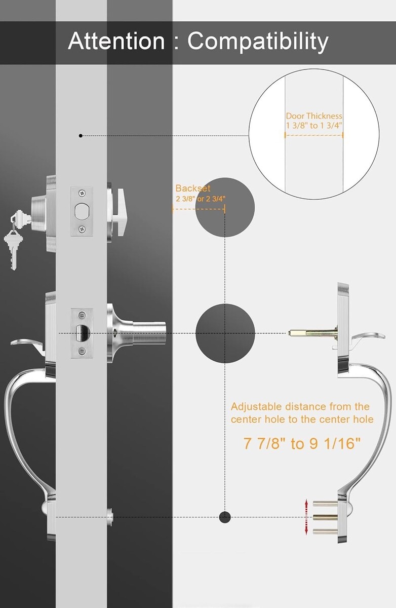 ?????????? ????? ??? ????????? - Adjustable latch to fit 2 3/8" and 2 3/4" backsets. Fits on 1 3/8" to 1 3/4" thick doors. Adjustable distance from the center hole of the handle to the center hole is 7 7/8" to 9 1/16". Before you purhcase the exterior door handle sets, measure the thickness and backsets