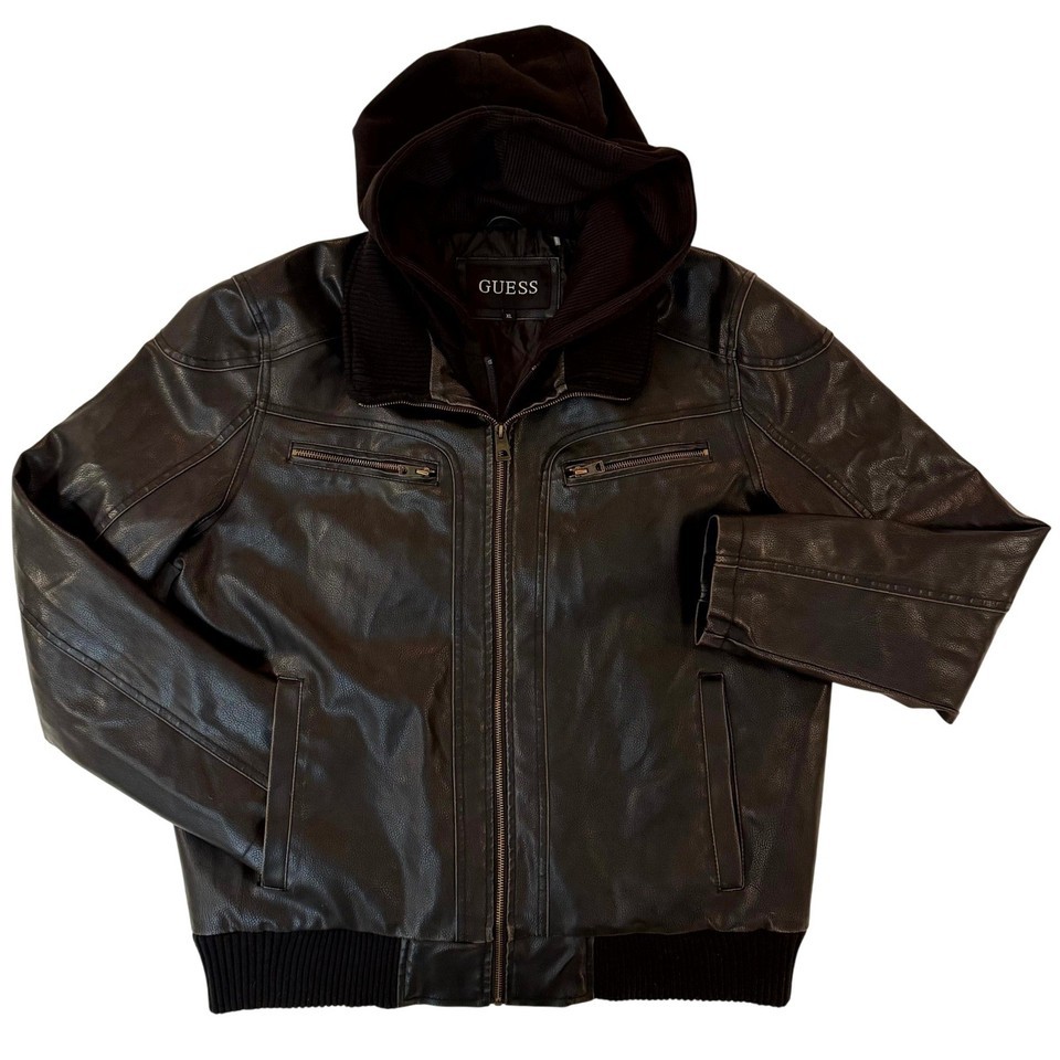- GUESS Men's Faux Leather Bomber/Flight Jacket Brown XL Hooded Zip-Out Insert