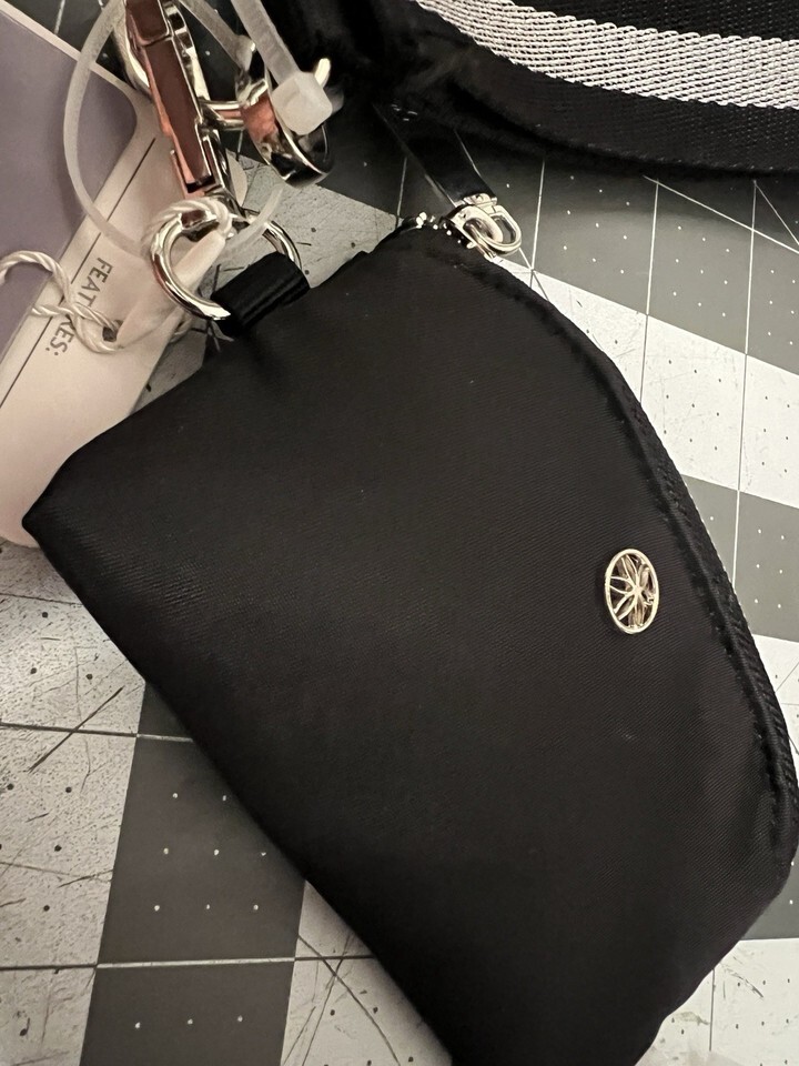 The GAIAM Duo Wristlet in Black/Silver is a stylish women's accessory designed as a wallet. This wristlet features a solid black color with metallic silver accents, giving it a sophisticated and trendy look. Made by the brand Gaiam, this wristlet is perfect for on-the-go use and adds a touch of glamour to any outfit. With its convenient wristlet style and compact design, this accessory is ideal for keeping your essentials organized in style.