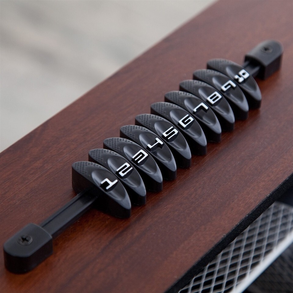 Foosball Table with 4 Soccer Balls. The silver feet and rich black-and-brown