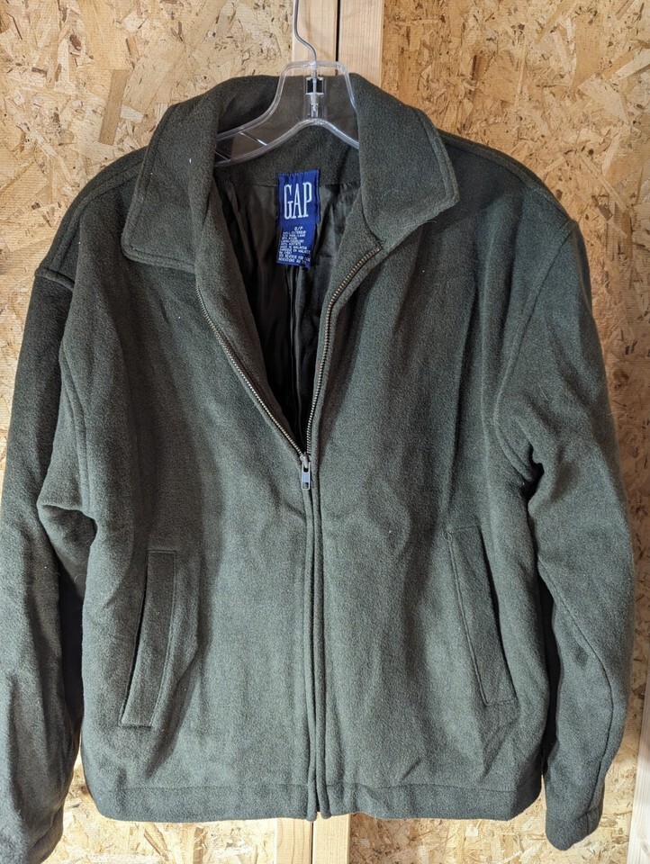 This Gap petite overcoat is a stylish addition to any woman's wardrobe. The wool-nylon blend material promises to keep you warm and comfortable, while the full zip closure makes it easy to put on and take off. The jacket is short in length and features a lovely green color that is sure to catch the eye. It is designed with a nylon outer shell material that is both durable and stylish. This coat is perfect for those looking to add a touch of sophistication to their wardrobe. It is designed to be both functional and fashionable. In addition to the full zip closure, it features a wool blend lining material that will keep you warm on those cold winter days. The petite size also makes it a great choice for those who are looking for a more tailored fit. 20" armpit to armpit and 12" armpit to waist
