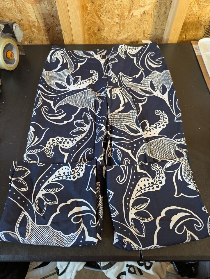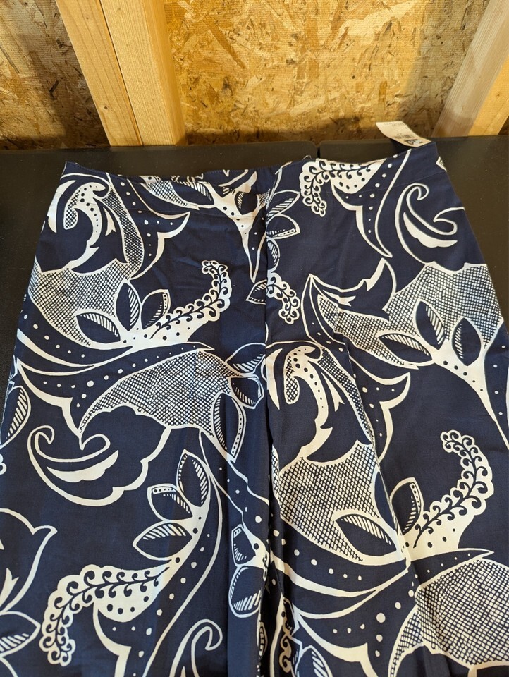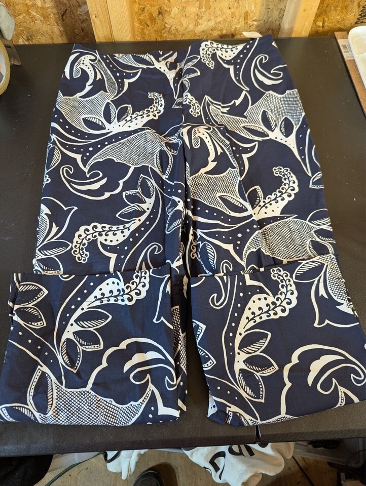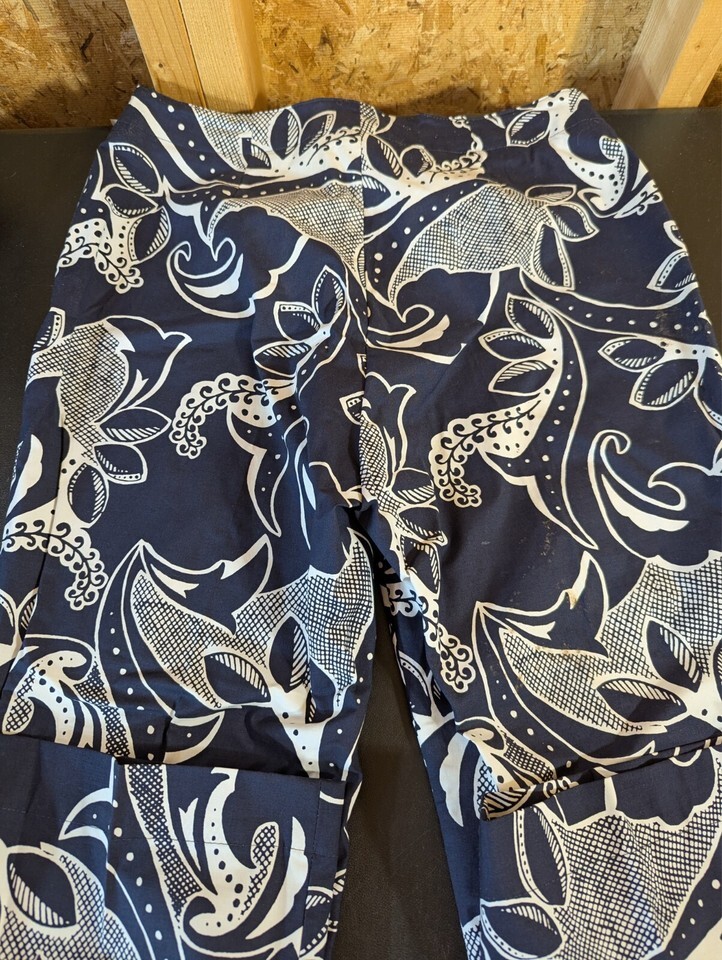 Gap size 12 cotton blend capris in blue and white floral pattern. Features zip and button closure, flat front, straight leg style, and has pockets. Suitable for travel or casual wear in summer, fall, or spring. Made of a knit cotton blend fabric with a 33-inch waist size and 22.5-inch inseam. Garment care is dry clean only. From Bahrain, this Gap capri is a versatile addition to a woman's wardrobe.