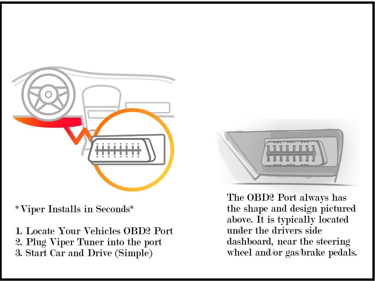 Installation is so easy anyone could do it. The tuner simply plugs into the OBD Port under your cars dashboard. This port is usually near the steering wheel on the drivers side. All vehicles made between 1996 and 2024 have this port and are compatible with the DynoPower Tuner Chip.