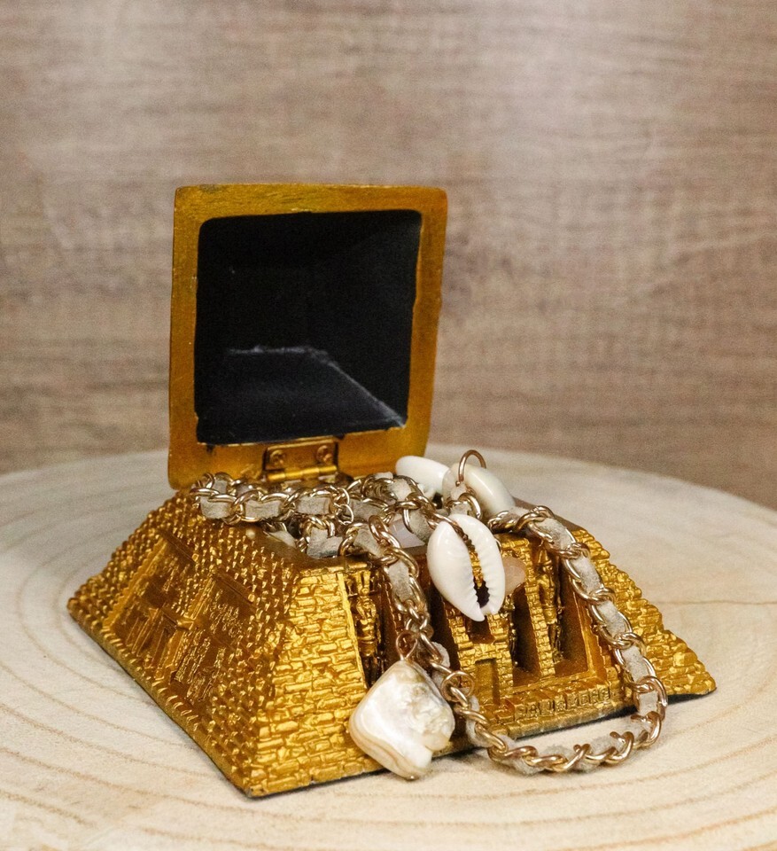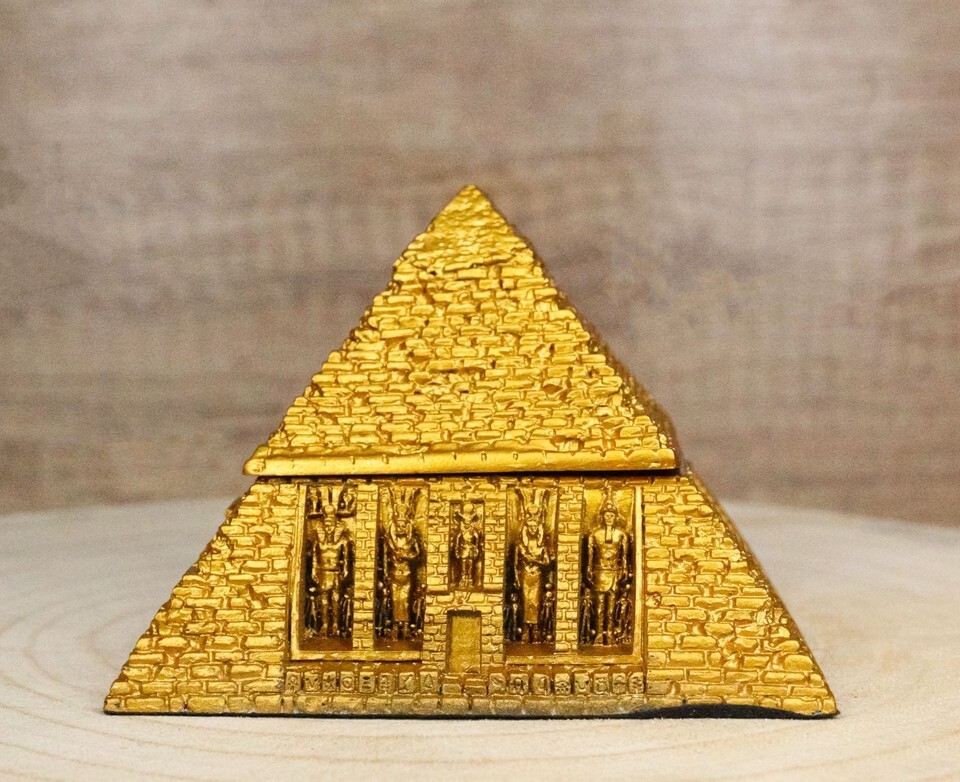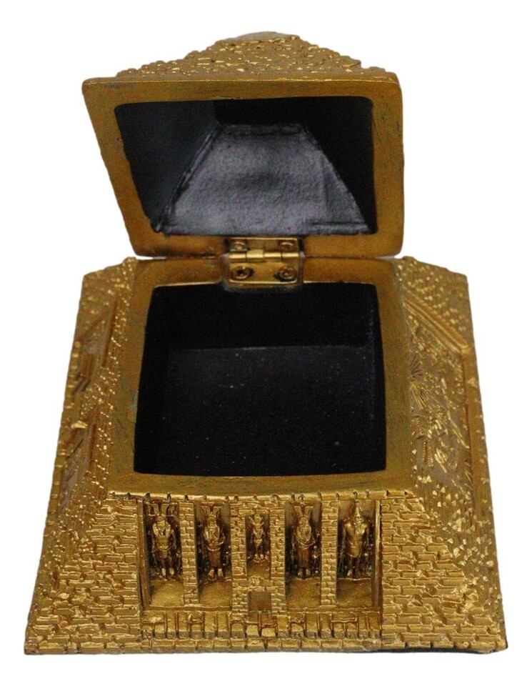 ? This Egyptian Gods Pyramid hinged jewelry box figurine is made of designer composite resin, hand painted and polished individually.