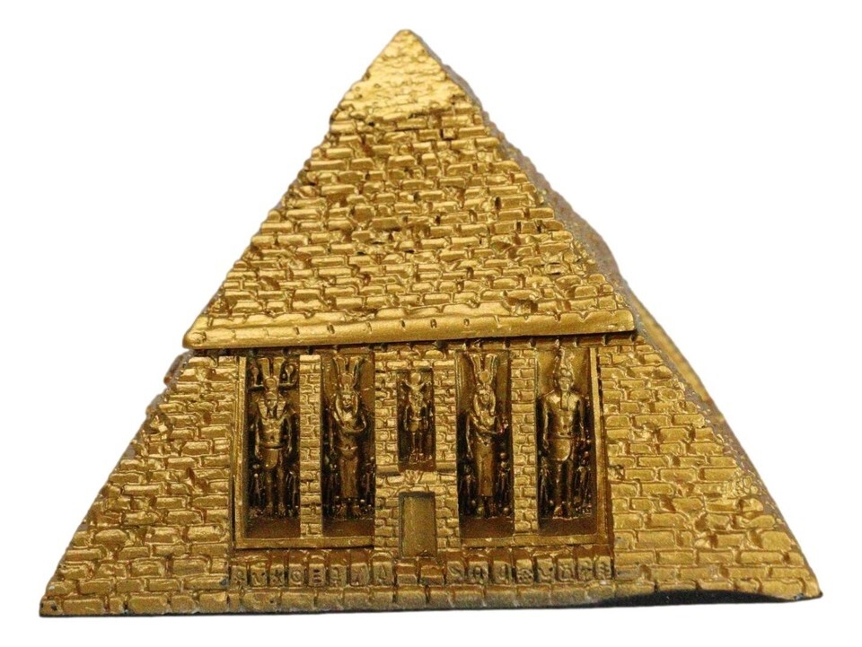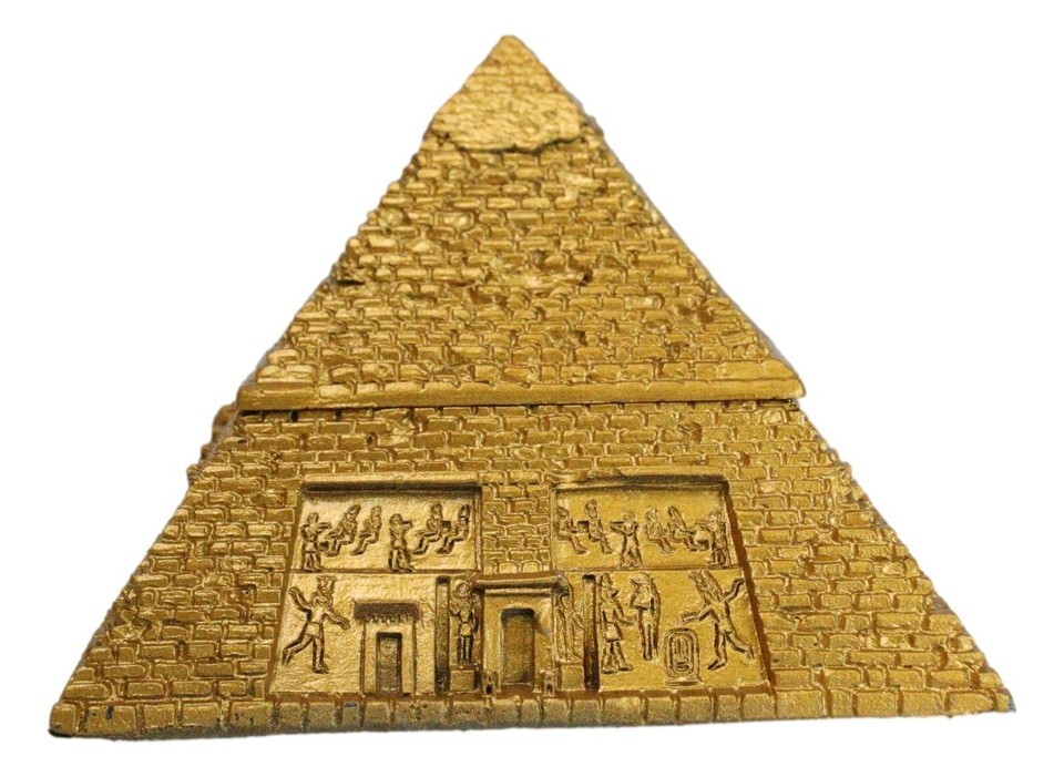 ? This stunning pyramid boasts of carvings of ancient gods as well as Egyptian symbols and hieroglyphs. It is a hinged jewelry box for storage as well as a beautiful egyptian themed decor or paperweight for any desk.
