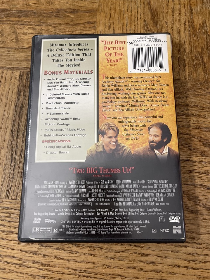The movie is a great addition to your collection if you're a fan of drama genre. It's a timeless story that has won several awards and has been a fan favorite since its release. So, don't miss out on this opportunity to own a collector's edition of Good Will Hunting.