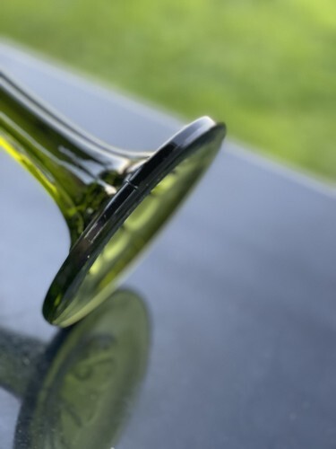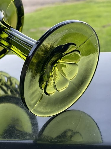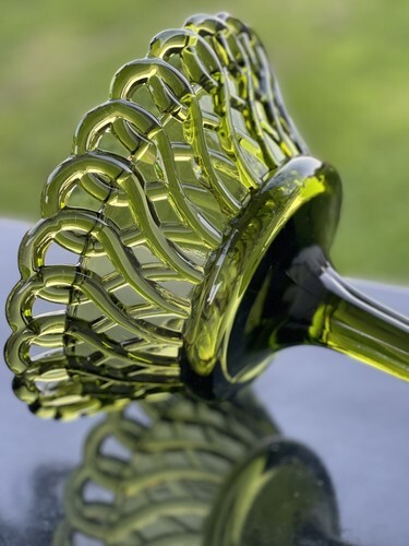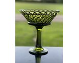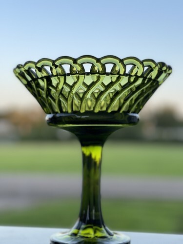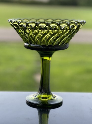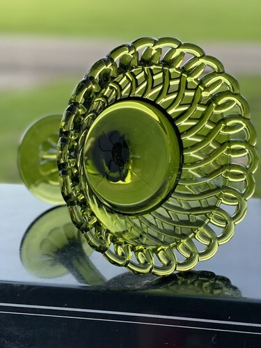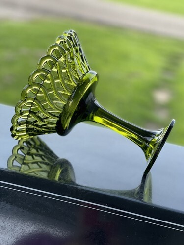 Green Glass Pedestal Compote Candy Bowl Reticulated Open Lace Edge Open Weave