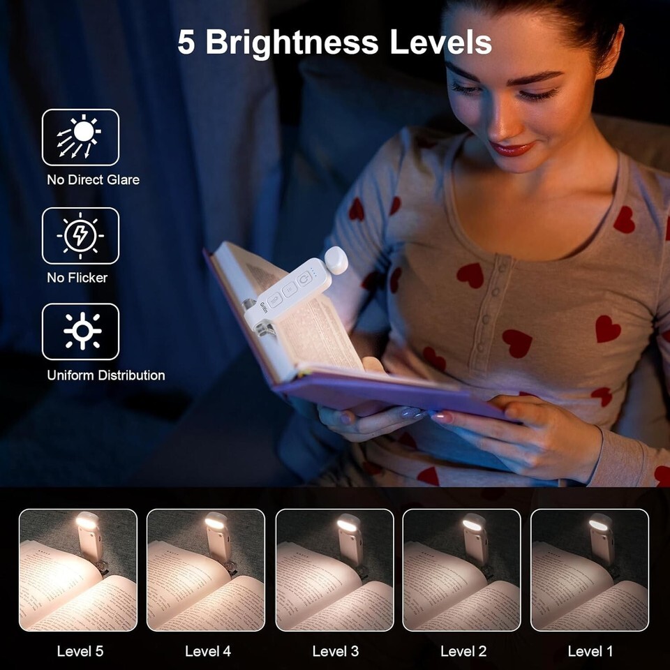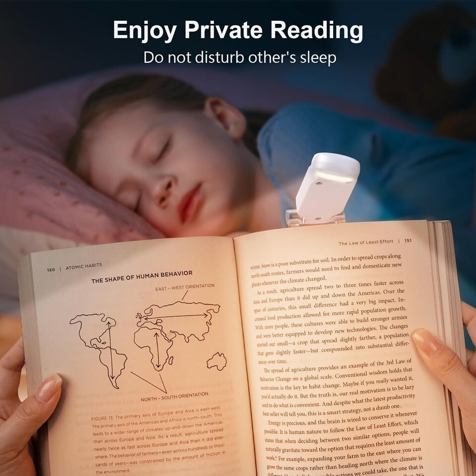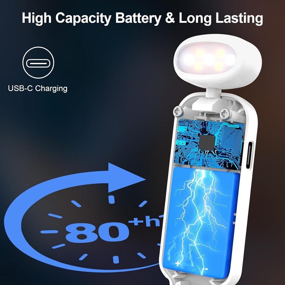 About this item ?5 Lighting Modes?The reading lamp has 3 color temperature modes to choose from: amber light (1800K)/mixed light (3400K)/white light (6000K) and 5 adjustable brightness modes, choose the most suitable mode according to your needs. It also has a brightness/color temperature memory function, which makes it more convenient and quick to use next time. ?Better Eye Protection?The 7 soft energy-saving LED beads are arranged evenly to fully simulate natural light, providing enough light to illuminate the book, light without strobe, without eye irritation. Even after long hours of use, it will not tire your eyes or your child's eyes, allowing you to fully enjoy your reading time. ?Large Capacity and Rechargeable?With a built-in 500mAh rechargeable lithium battery, this LED reading light can last from 8 to 80 hours (depending on the light mode), is economical and environmentally friendly. The charging time is short with the included Type-C cable, offering you the convenience on the go. In addition, there are 4 indicators to show you the remaining power. ?Flexible Multi-angle Design ?The lamp head adopts multi-angle rotation design, which can rotate 90 left, 90 right and 45 down, at the same time the lamp body can rotate 360, perfectly meeting your needs and facilitating better reading for you and your family. ? Lightweight and Portable ?Made of high quality ABS+ metal, it is shockproof and wear-resistant, and at the same time lightweight, fully foldable, making it very easy to carry. Whether you are traveling or at home, it will be perfect for your night reading, books, magazines, bedtime stories, newspapers and more.