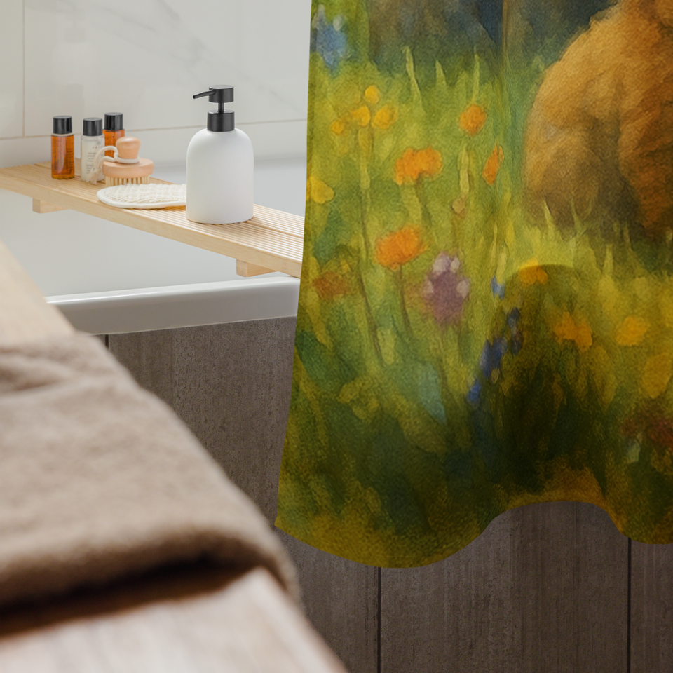 Bring the beauty of the Alaskan wilderness into your bathroom with this stunning shower curtain, featuring a watercolor-style illustration of a family of grizzly bears relaxing in a sunlit meadow. With wildflowers blooming at their feet and majestic mountains in the background, this design captures the peaceful charm of nature.