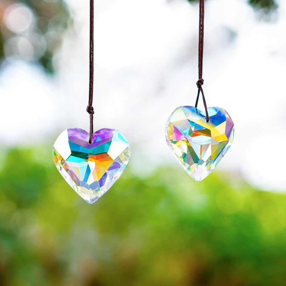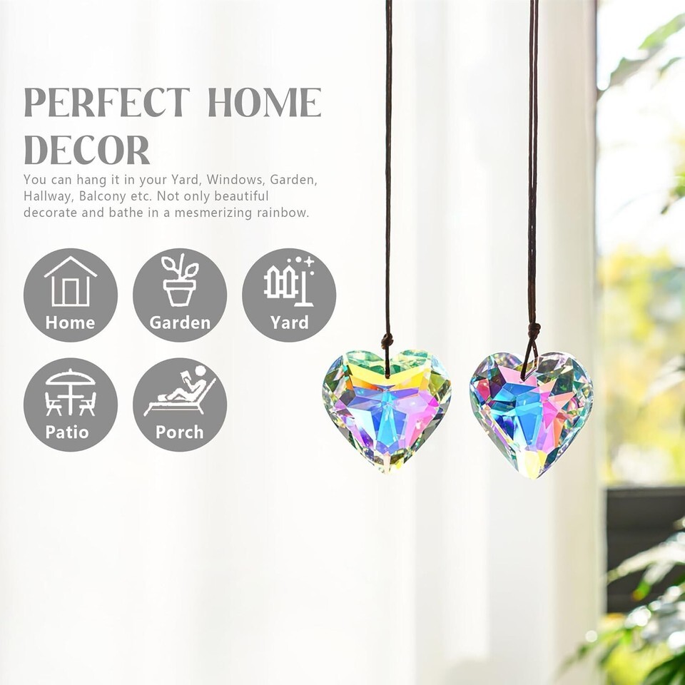 Perfect Size: Size:50 mm;Nw:55 g/pcs.Parcel contains 2 pcs crystal heart shaped prisms.Easy to hang.The AB color coating enhances its enchanting beauty, making it a captivating addition to your outdoor decor