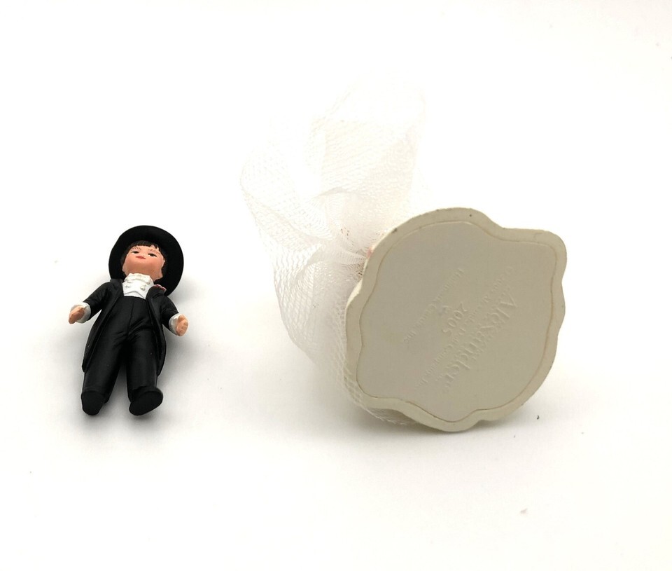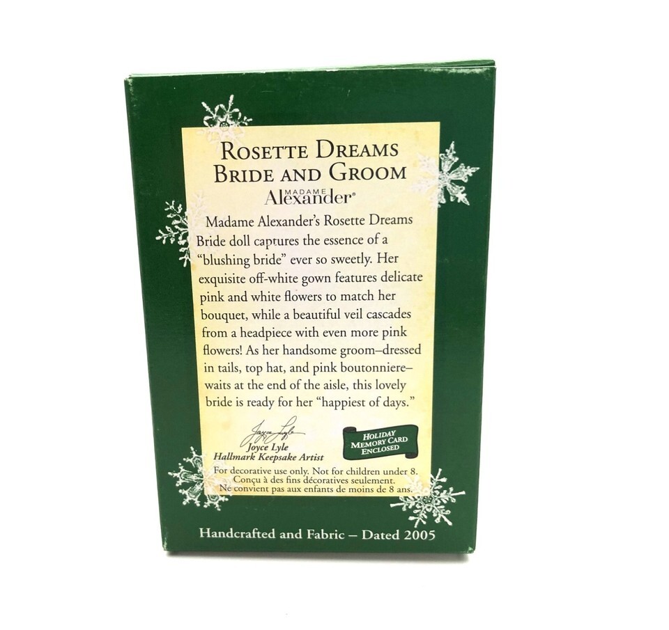 Hallmark Keepsake Christmas Ornament Madame Alexander Bride and Groom from the Miniature Rosette Dreams Collections. These Keepsake Ornaments were originally produced and released by Hallmark in 2005.. The ornament is just over 1 1/2 inches tall and is in good condition, box may show some minor wear that is typical with vintage items. I have more holiday decorations and I do offer calculated shipping in cart when you purchase multiple items from my shop.