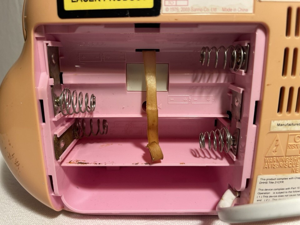 This Sanrio Hello Kitty boombox is a must-have for any fan of the franchise. It features an AM/FM radio, CD player, and power cord. Additionally, it is battery-operated and has a cute Hello Kitty design. The boombox is in good working condition and has been tested. The item is 9 inches in height, 10.5 inches in width, and weighs 4 lbs. It was manufactured in 2003 and is made of plastic. The boombox is pink in color and has a faded design. It is perfect for collectors of animation merchandise and other fans of Hello Kitty.