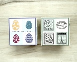 This beautiful Fanciful Eggs and French Postage wood mount stamp sets by Hero Arts features Easter eggs and the Eiffel Tower, script with butterflies and heart images that would be perfect for a card, scrapbook, mini album, planner, journal or other paper crafting project. Wonderful sets! There are 4 stamps in each set. These stamps are vintage retired sets and are unopened and unused in the original packaging. Each set in the box measures a 2 inch square size.