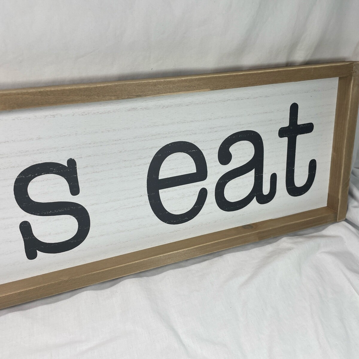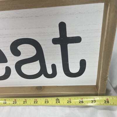 The Hobby Lobby Rustic Let?s Eat Sign is a charming and rustic addition to any home decor. This primitive-style sign features the phrase "Let's Eat" in a distressed, vintage look. Measuring 28x8.5 inches, this wooden sign is perfect for adding a touch of farmhouse flair to your kitchen or dining area. Display it on your wall or shelf to create a warm and inviting atmosphere for family and friends. Pre-owned, great condition