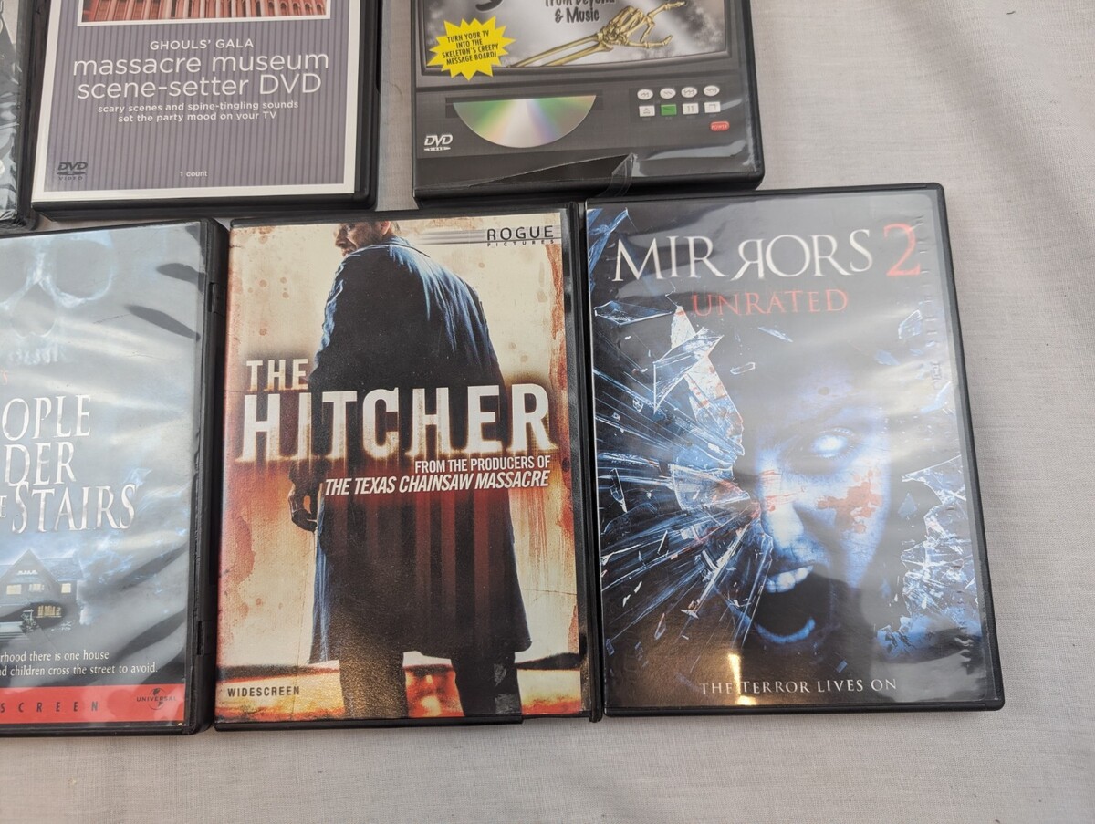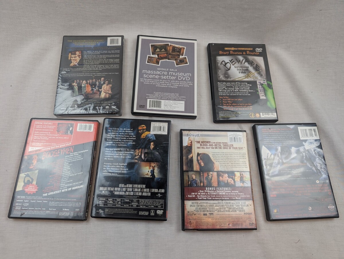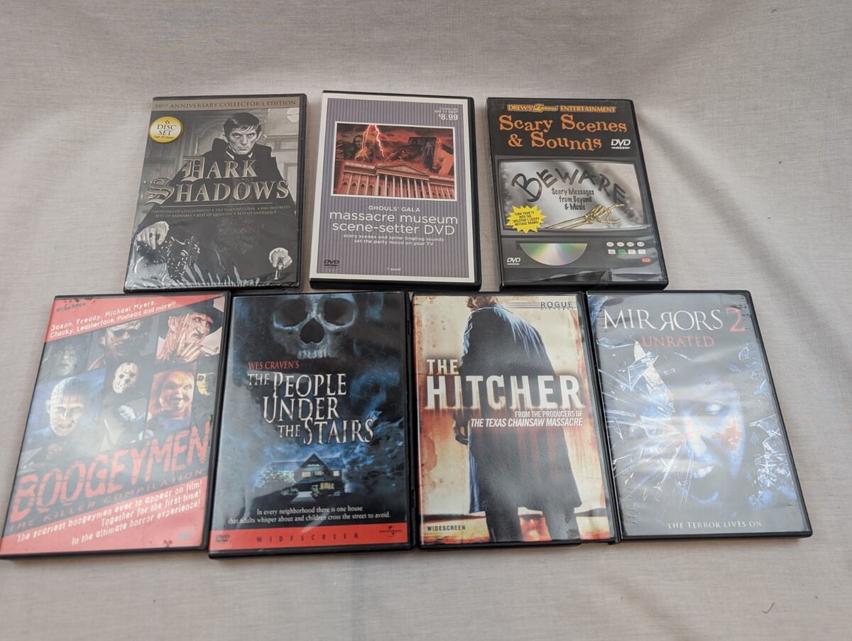 Up for sale is a Horror DVD Lot of 7 Includes: Boogeymen The Killer Compilation (NR) Wes Craven's People Under The Stairs (R) The Hitcher (R) Mirrors 2 (unrated) Dark Shadows 50th Anniversary 6 disc set (Sealed) (Not Rated) Ghouls Gala Massacre Museum Scene Setter DVD (20 minutes of continuous play) Scary Scenes Sounds Buyer to pay for USPS Media Mail, Ground Advantage or Priority Mail shipping. I ship no later than next day after payment. I will combine shipping if paid together. If you buy multiple items from me, please wait for a combined invoice before paying. I will accept returns within 30 days. From a smoke free home I am an honester who buys and sells things to have fun and make a little extra cash -- this is not my primary job. If for any reason you are not completely happy please let me know before leaving negative or neutral feedback, leaving less than 5 on the Detailed Seller Ratings or getting involved and I will make it right. Thanks