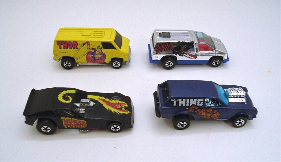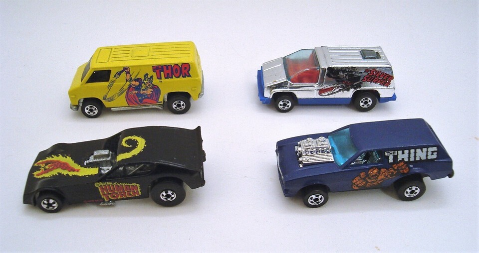 Nice set of Heroes cars from 1979 based on Marvel Comics Characters. Cars included are: Captain America (Pontiac Firebird), Human Torch (Firebird Funny Car), Incredible Hulk (Spoiler Sport Van), The Thing (Ford Pinto Wagon), Thor (Super Van), Spider-Man(Concept Car), Silver Surfer (Concept Van) and Iron Man (Corvette Van). Cars have never been played with and displayed only. I would rate all cars NM+ condition. Please see all pics.