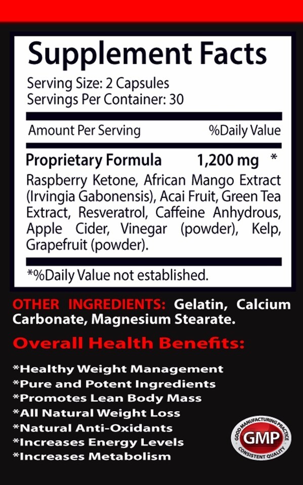 Raspberry Ketone, African Mango Extract (Irvingia Gabonensis), Acai Fruit, Green Tea Extract, Resveratrol, Caffeine Anhydrous, Apple Cider, Vinegar (powder), Kelp, Grapefruit (powder).