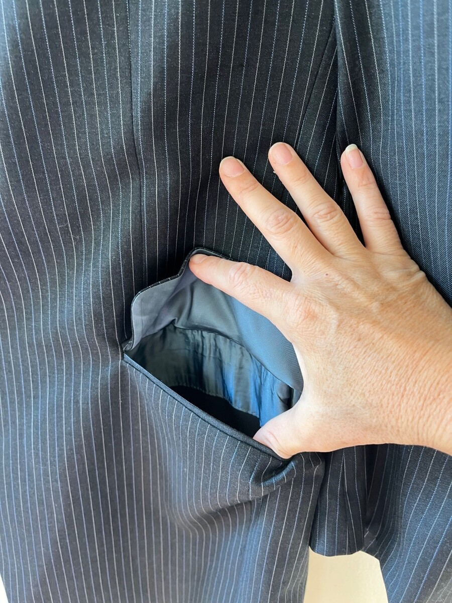 2 button single breasted blazer with 3 pockets in the front, 3 on the inside.