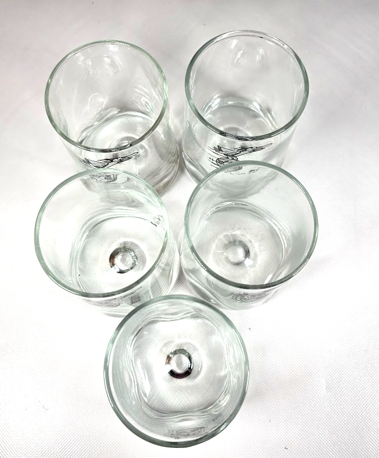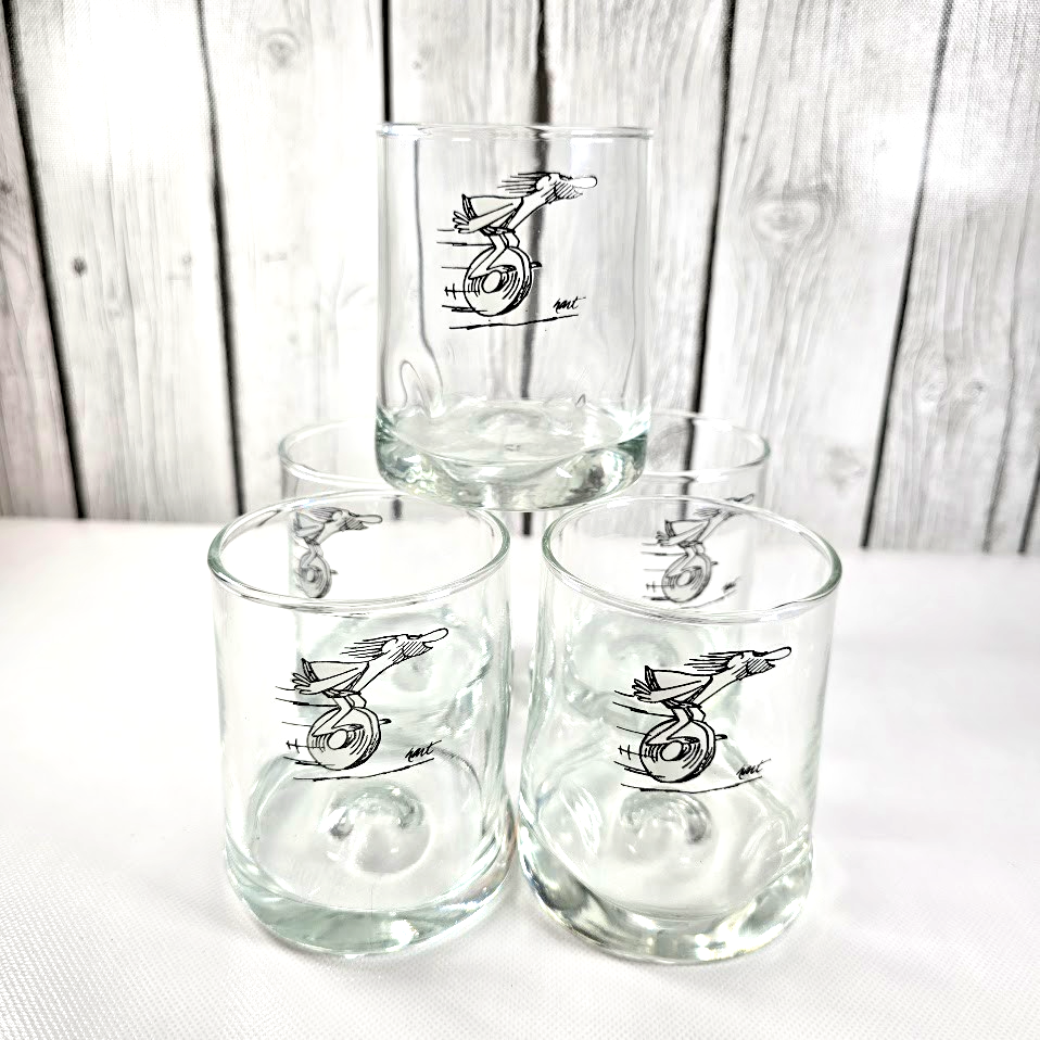 A nostalgic 1970s bar?ware set featuring the caveman ?Thor? character from the beloved comic strip B.C. by Johnny?Hart riding his stone wheel ? these five heavy pinched?base lowball glasses are witty, playful and full of vintage charm. Whether you?re a collector of comic strip memorabilia or stylish bar?ware enthusiast, this set brings personality to any display or bar cart. Set of five (5) lowball / rocks glasses featuring Thor on a wheel/unicycle from the B.C. comic strip by Johnny?Hart. Heavy pinched?base ?ice?age? style rock glasses ? ideal for whiskey, cocktails or retro display. Vintage 1970s era collector bar?ware ? perfect as a gift for comic strip fans or vintage drinkware collectors. Graphics remain crisp (check photos) ? no major chips or cracks noted; some light surface wear consistent with age. Made in the USA (likely by Anchor Hocking or similar 1970s glass?maker under B.C. license) ? part of the broader B.C. comics drinkware series.