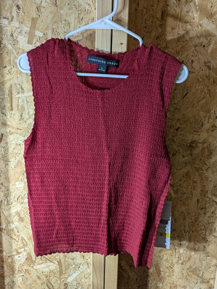 Introducing this stylish red tank made by Josephine Chaus, perfect for any fashion-conscious woman. The top has a solid pattern with a sleeveless design, round neckline, and pullover closure. It is made from lightweight and stretchy polyester crepe material, knit in Korea, making it ideal for spring and summer seasons. The garment care is easy as it is machine washable. This tank is perfect for casual and formal occasions. The top is available in medium size, regular fit, and is not personalized. Get this basic style to add to your wardrobe today. 32" chest and 22" length