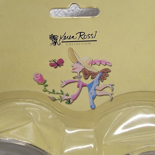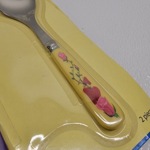 Karen Rossi Collection Serving Utensils Salad Spoon Fork Fruit Flowers. Package is a little bent/has some spots on the back as seen in images but utensils are still new in package?Images show actual item that will ship.