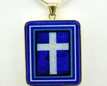14k yellow gold intarsia pendant made with an opal cross in the center. The inlay was made with opal, lapis, turquoise, and black and white agate. The intarsia was made and signed by Jim Kaufmann and has a custom 14k bezel.