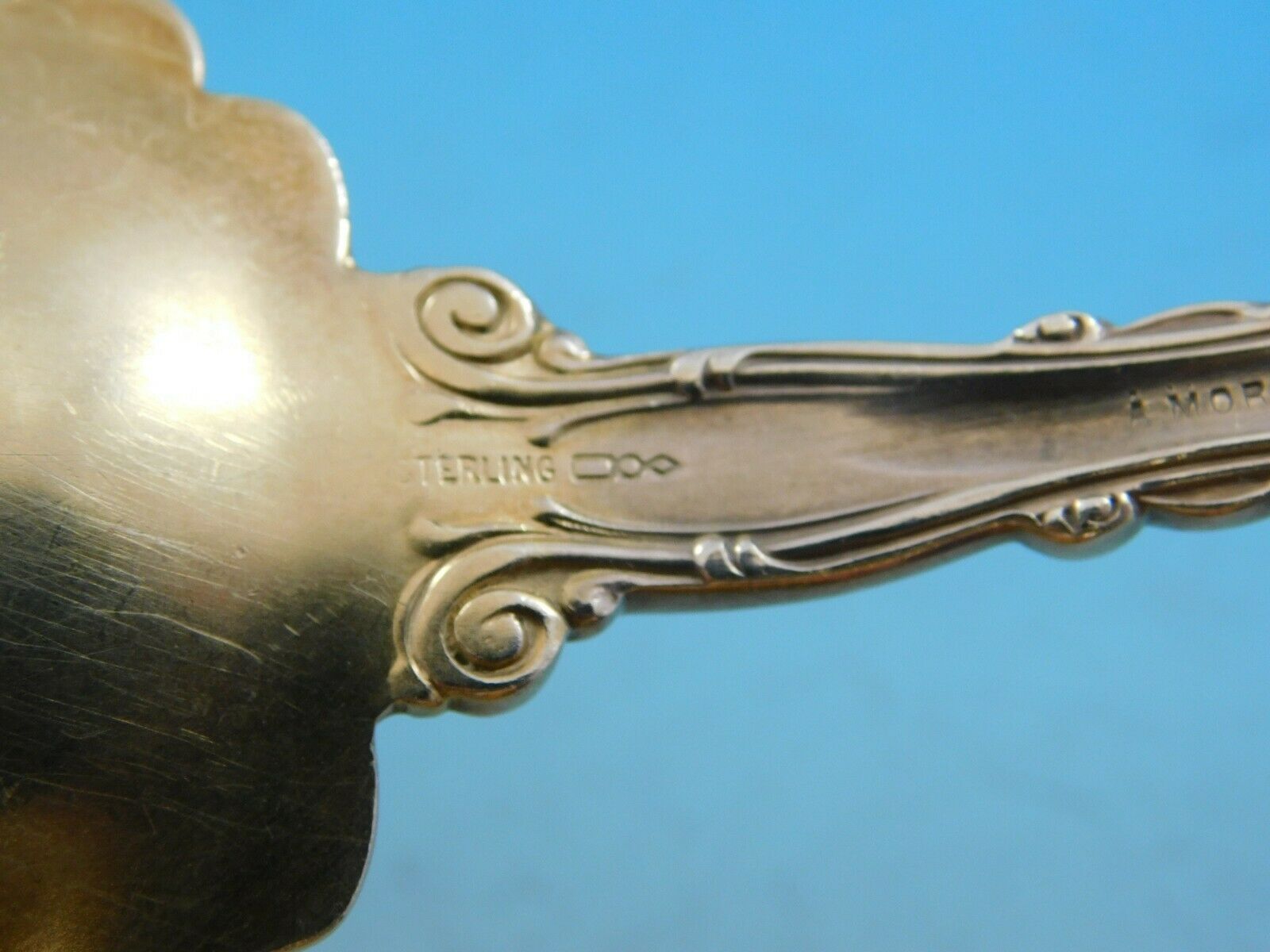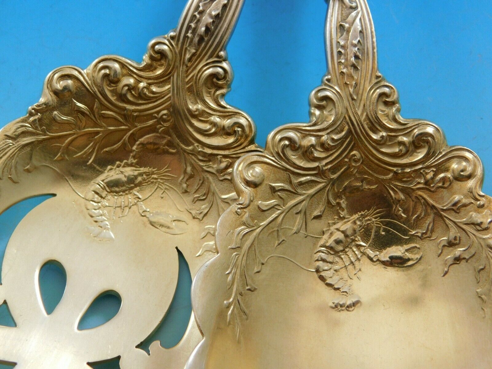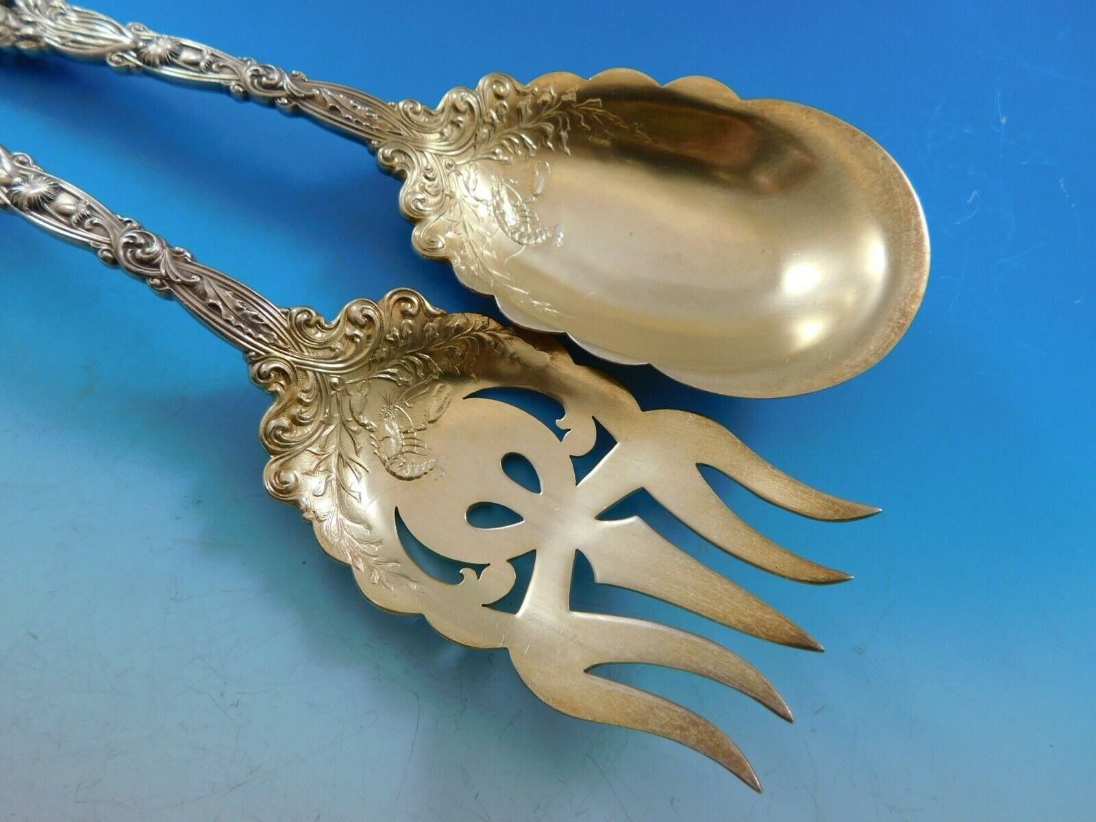 Vintage Sterling Silver Salad Serving Set, gold-washed, old, 9 1/2" in the pattern Labors of Cupid by Dominick and Haff. It is not monogrammed and is in excellent condition.