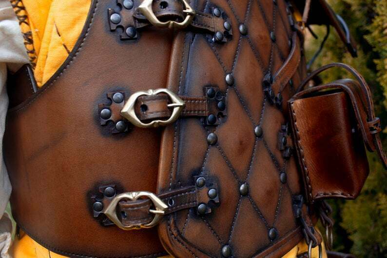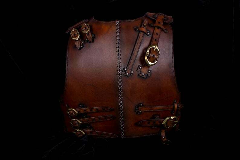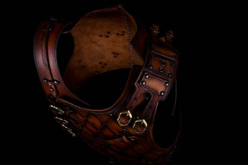 This armour, handcrafted in 3-3,5mm thick premium leather and dyed by hand, it will be the best friend of the adventurer. Designed to allow maximum movement and protection, our breast armour is equipped with 20mm straps prepared to carry holders, small pouchs, daggers and everything your character could need. The shoulder strap is ready to adapt to any kind of shoulder armour and itโs back is equipped too with straps designed to hold a back scabbard. This armour is designed to be equipped with no help, as it can be opened from the front or from side. The buckles are in brass, ready to resist any stress the armour will have.