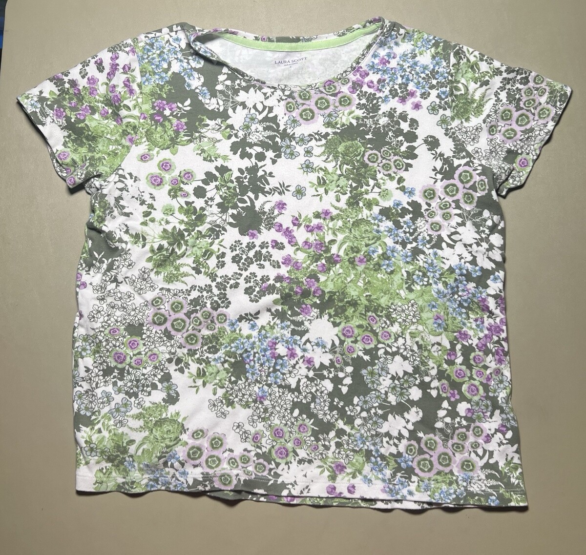 The Laura Scott Top is a stylish women's blouse featuring a colorful floral print on white. This short sleeve top in size L is designed for regular size women and comes from the brand Laura Scott. Made for women's department, this blouse is a fashionable addition to any wardrobe, adding a touch of floral elegance to any outfit.