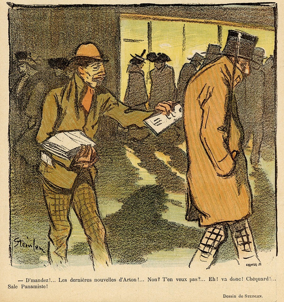 Le Rire- Panama by Theophile Alexandre Steinlen Circa 1890 Sheet size 9 x 12" A page from Le Rire magazine, "The latest news from Arton! No? I don't blame you! Eh! Go! Chequard! Dirty Panamist!" A political themed cover.
