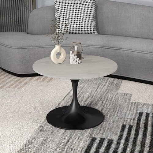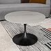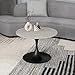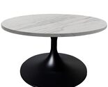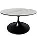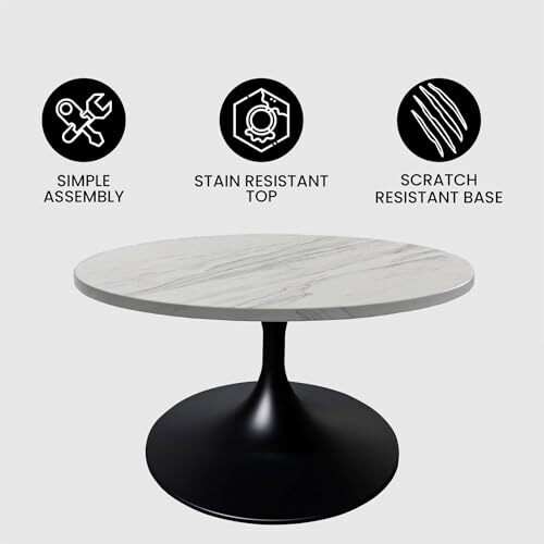 Bullet point: [CLEAN AND ELEGANT DESIGN] This coffee table features a round resin top with a marbled look, offering refined visual texture. The smooth surface is paired with a black tulip pedestal base that provides sturdy support. The marbled finish and solid base create a harmonious design that enhances the table?s modern look. With its clean lines and minimalist style, this table easily complements various interior settings.