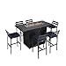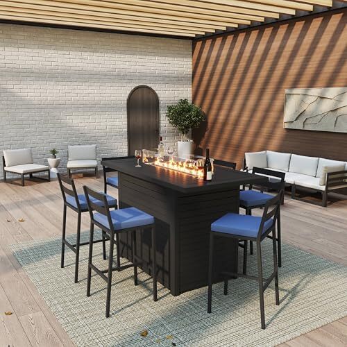 Bullet point: [7-PIECE SET] This set includes one fire pit bar table and six bar chairs, each featuring a low open-back design in a sleek black matte finish that enhances airflow for a cool seating experience. The stools have a contemporary look suited to outdoor settings, designed for gatherings around the fire pit table.