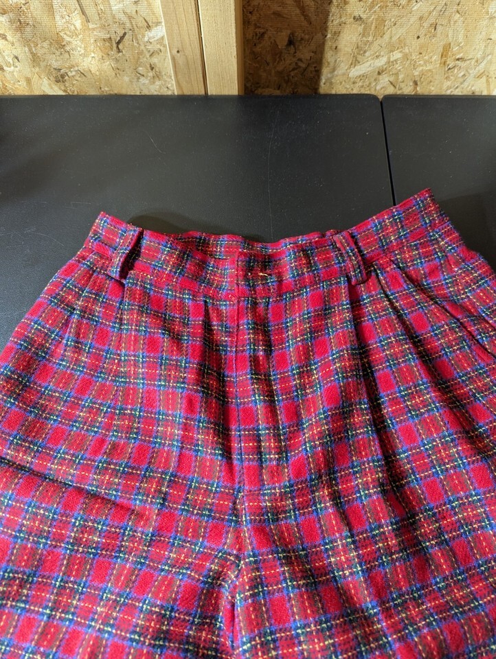 Liz Sport red plaid shorts are made of a wool blend fabric with an acetate lining. They feature a pleated front, button closure, and slash pockets. These vintage shorts have a mom style and are designed for women in size 10. They are lined and require dry cleaning only. The shorts are not personalized and are made in Colombia.