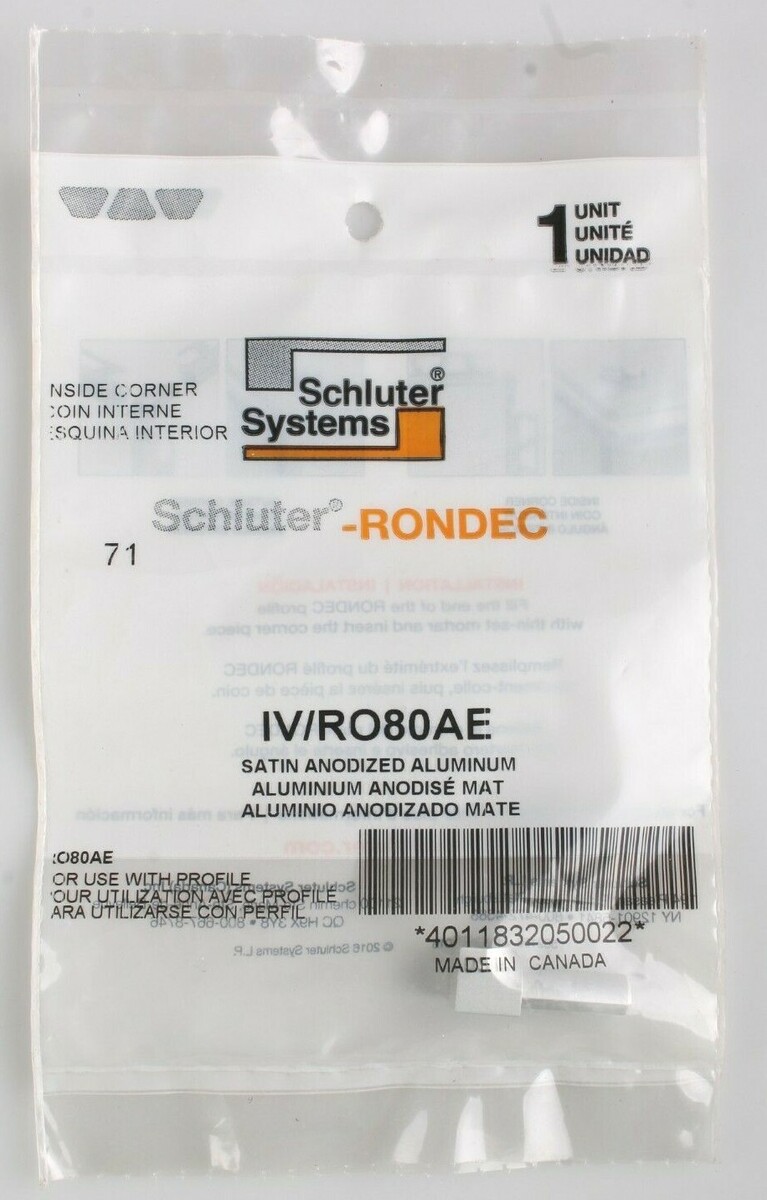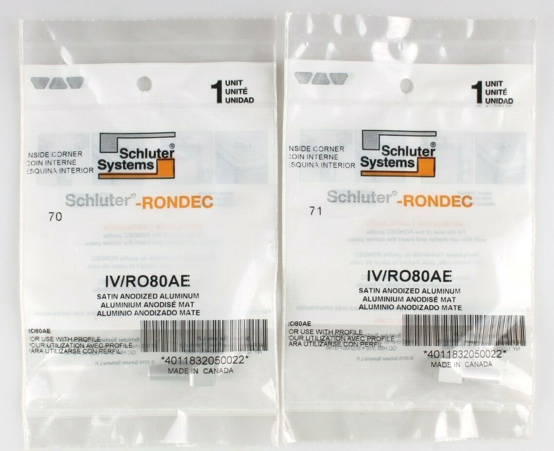 When ordering from the US, parcels may be subject to import tax and duty charges, which the buyer is responsible to pay. Lot 2x Schluter Systems IV/RO80-AE RONDEC Satin Aluminum Inside Corner SEALED This product data sheet is originally written in English. This is for a lot of Two (2) Schluter Systems IV/RO80-AE RONDEC Satin Aluminum Inside Corners In factory sealed plastic bags Finishing and edge protection for tiled edges and outside corners of tiled surfaces Allows creation of interesting accents in decorative design Anodized aluminum and PVC features an integrated joint spacer that establishes a defined joint cavity between the tile and the profile This is for a lot of Two (2) Schluter Systems IV/RO80-AE RONDEC Satin Aluminum Inside Corners In factory sealed plastic bags Finishing and edge protection for tiled edges and outside corners of tiled surfaces Allows creation of interesting accents in decorative design Anodized aluminum and PVC features an integrated joint spacer that establishes a defined joint cavity between the tile and the profile