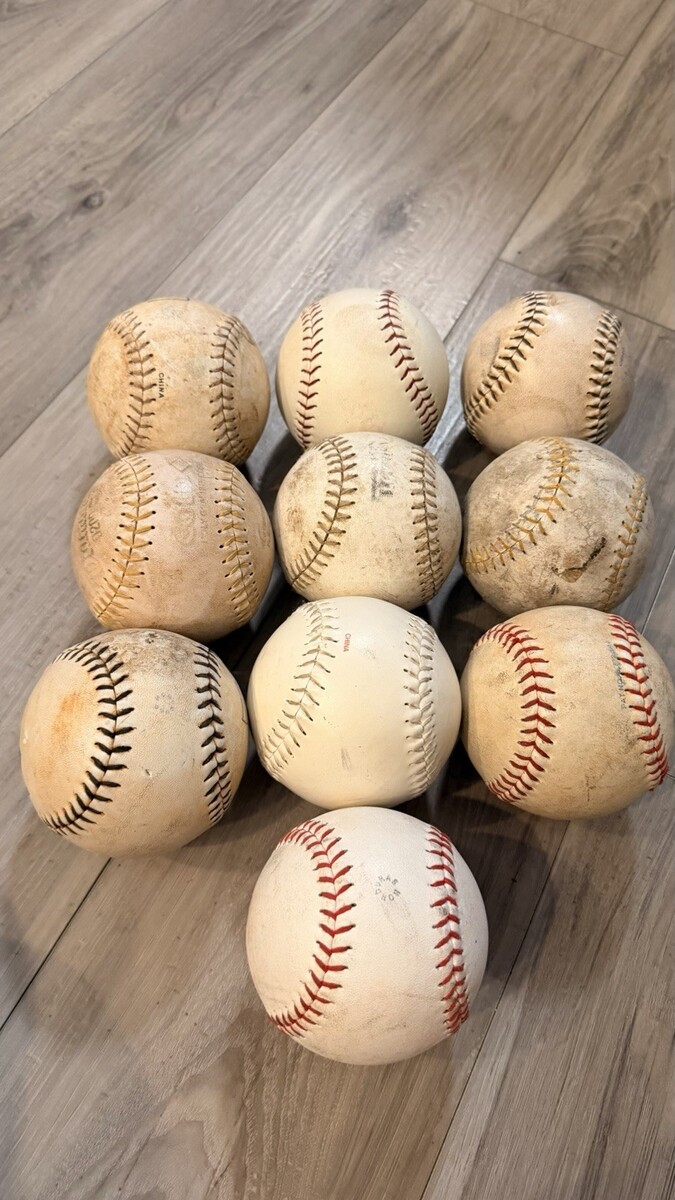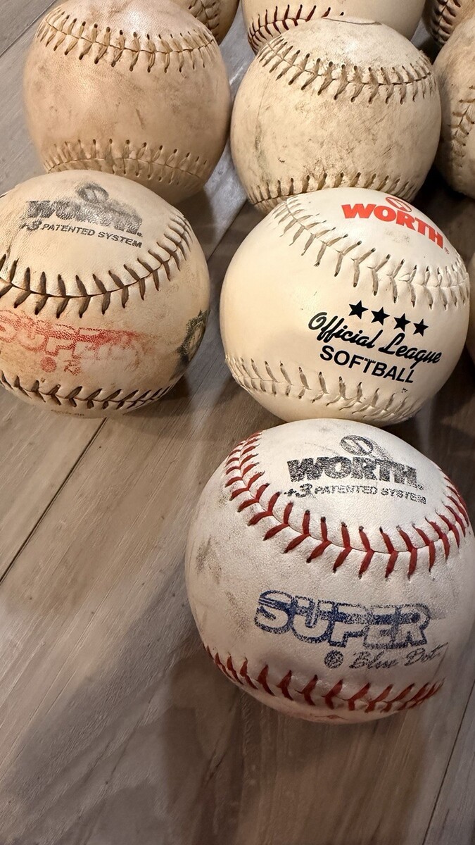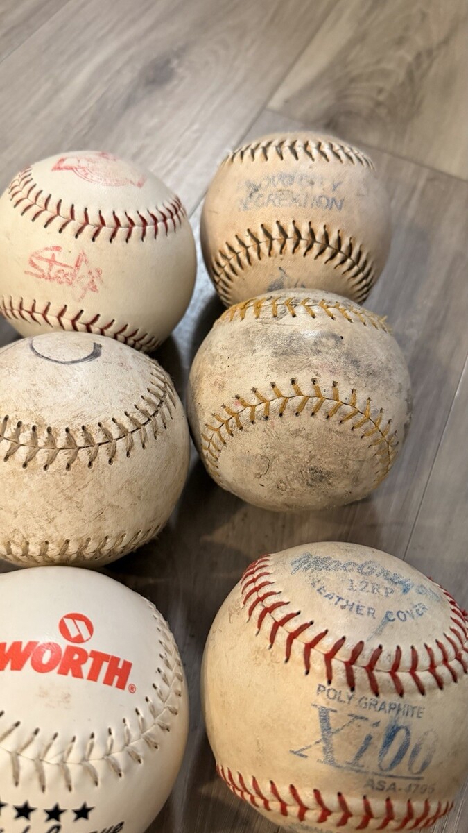 Lot of 12 white leather softballs. Pre-owned condition as shown. No torn seams, cuts, or defects. FREE Shipping