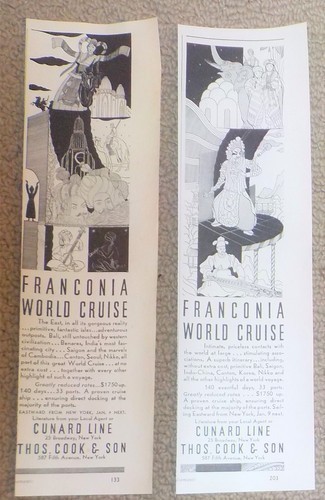 5) Lot of 2- 1920s/30s CUNARD LINE Print Ads Far East, Orient, SS Franconia B1O Ad Size (Approximate Overall) 3" x 11"