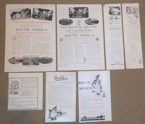 9) Lot of 7-1920s/30s SOUTH AFRICA Print Ads Cruise, Railroad, SA Travel Bureau B1L Ad Size (Approximate Overall) 3" x 11 1/2"" to 8" x 11 1/2"