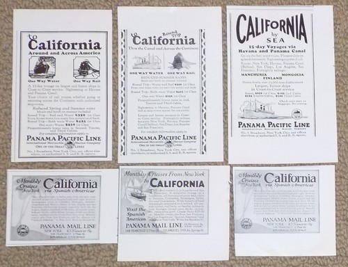 13) Lot of 6 - 1920s/30s CALIFORNIA Print Ads Panama Pacific Panama Mail Lines B1C Ad Size (Approximate Overall) 3" x 5" / 3" x 3 1/2" / 3" x 2 1/4"