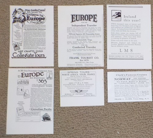 3) Lot of 6 - 1920s/30s EUROPE TOUR Print Ads Ireland, Norway, Cruise, Railroad B1E Ad Size (Approximate Overall) 2 1/2" x 3 1/2" to 3 1/2" x 5"