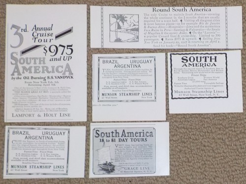 1) Lot of 6- 1920s/30s SOUTH AMERICA Print Ads Munson Steamship, Lamport Holt B1E Ad Size (Approximate Overall) 2" x 3" to 2" x 6 1/2" "