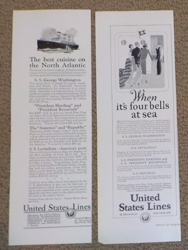 2) Lot of 2- 1920s/30s UNITED STATES LINES Print Ads SS Republic, SS America B1N Ad Size (Approximate Overall) 3 1/2" x 10"