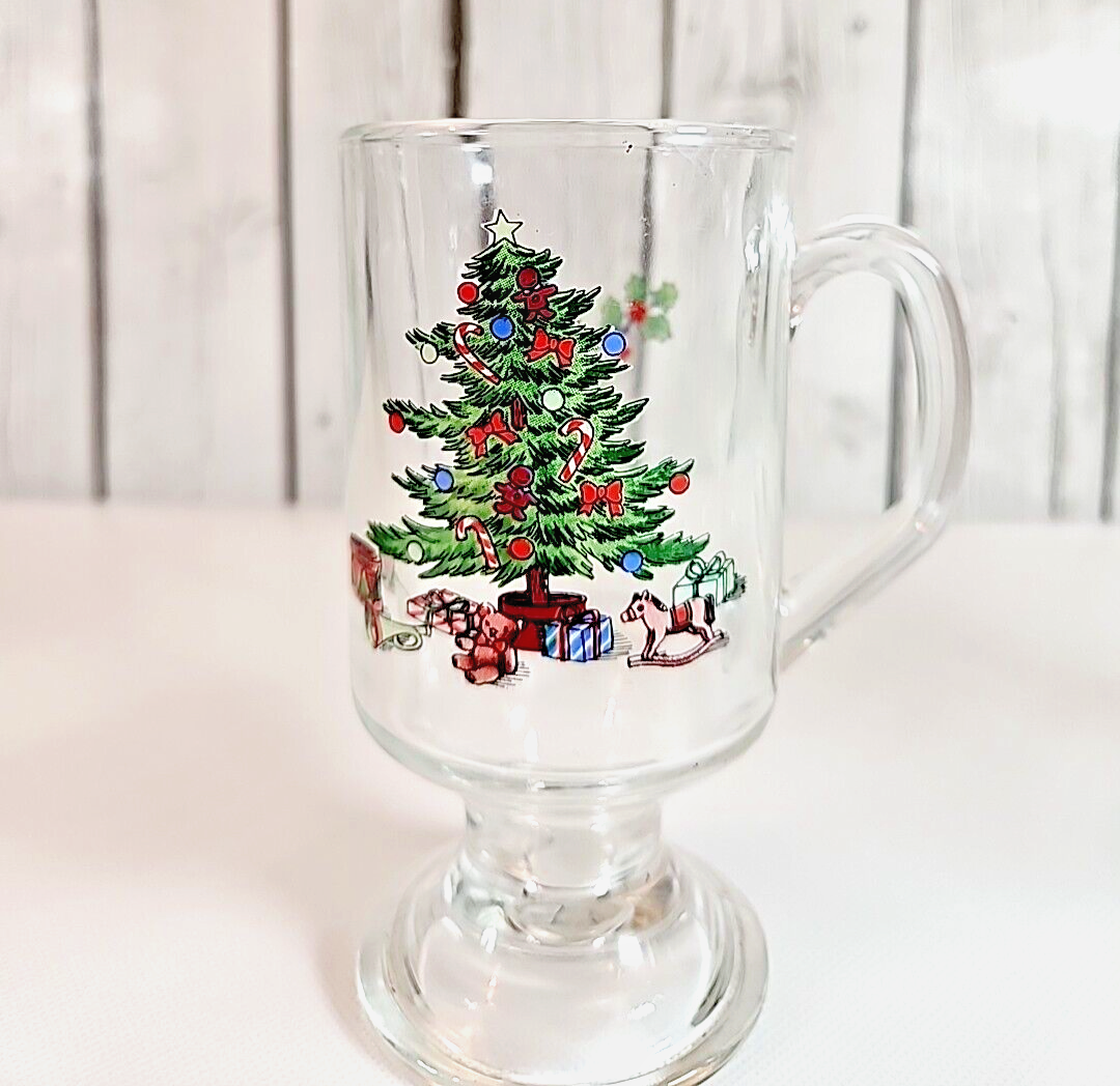 This vintage Luminarc set includes two clear glass mugs featuring festive Christmas trees and holly accents, perfect for serving cocoa or mulled wine during the holidays. A charming choice for holiday entertaining or as a nostalgic hostess gift. ? Set of 2 vintage Luminarc glass mugs with Christmas tree and holly design ? Clear glass with colorful holiday motif and elegant curved handles ? Great for hot chocolate, cider, or seasonal coffee drinks ? Ideal for vintage holiday decor or a festive hostess gift
