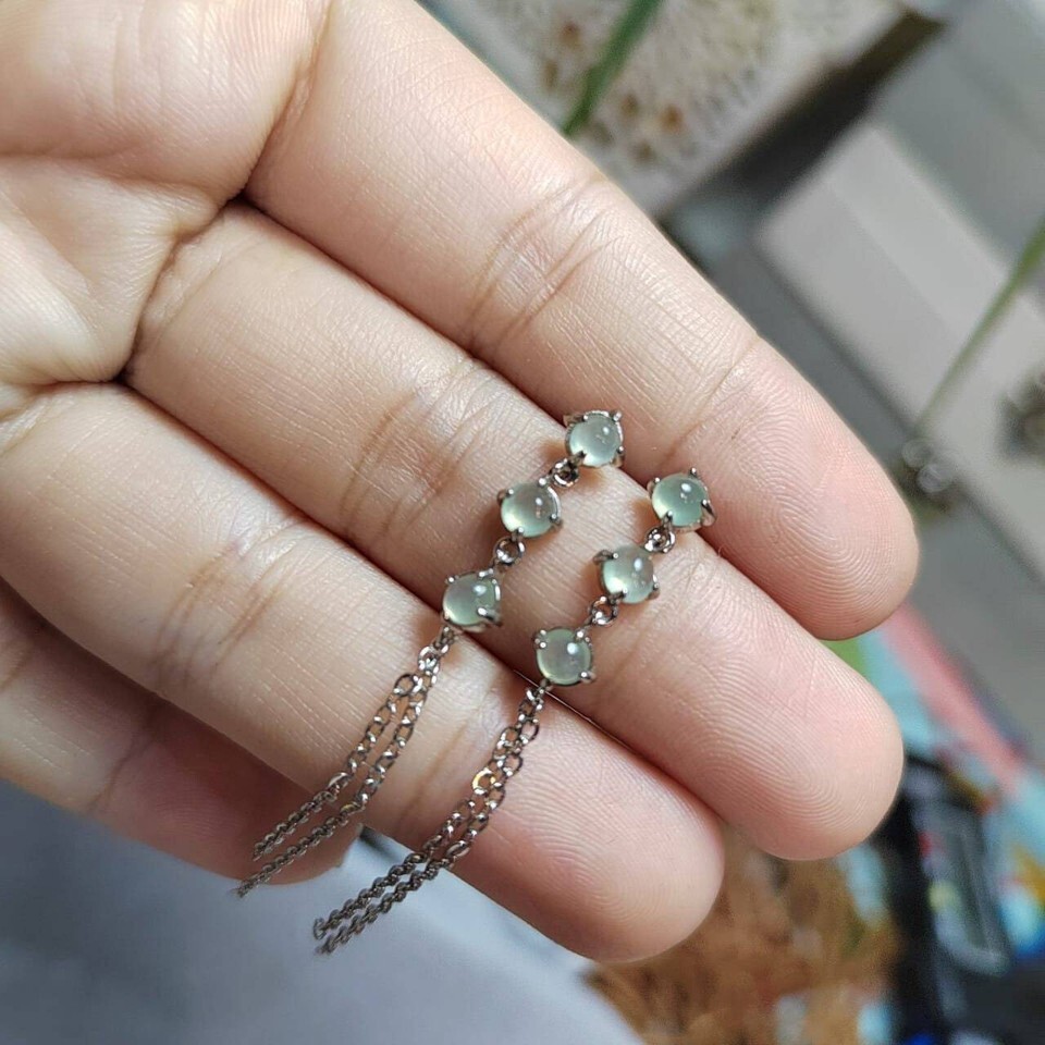 These elegant earrings feature certified A-grade natural untreated Burmese jadeite in a soft icy white hue, set in high-quality S925 sterling silver. The jadeite stones have a smooth, translucent surface that enhances their refined appearance, making them suitable for both everyday wear and formal occasions.