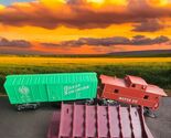 This Marx O Scale Lot features a vibrant Santa Fe Caboose and two 34178 Great Northern Box Cars. The set, in a classic green and red color scheme, adds a nostalgic touch to any model railway collection.