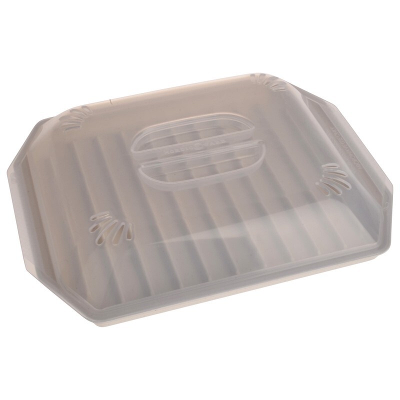 Nordic Ware Microwave Safe Covered Bacon Rack with Lid in White Plastic with Lid. Prevent the greasy mess of making bacon the traditional way by using the Nordic Ware covered bacon rack in the microwave for mess free and quick cooking. The covered bacon rack has a compact design that fits in even the smallest microwaves. The clear lid prevents messy splatters and the ribbed design elevates food above the drippings so the grease flows away. Great for cooking bacon, sausage, hot dogs as well as heating leftovers and defrosting foods. This is made from BPA and Melamine free plastic.