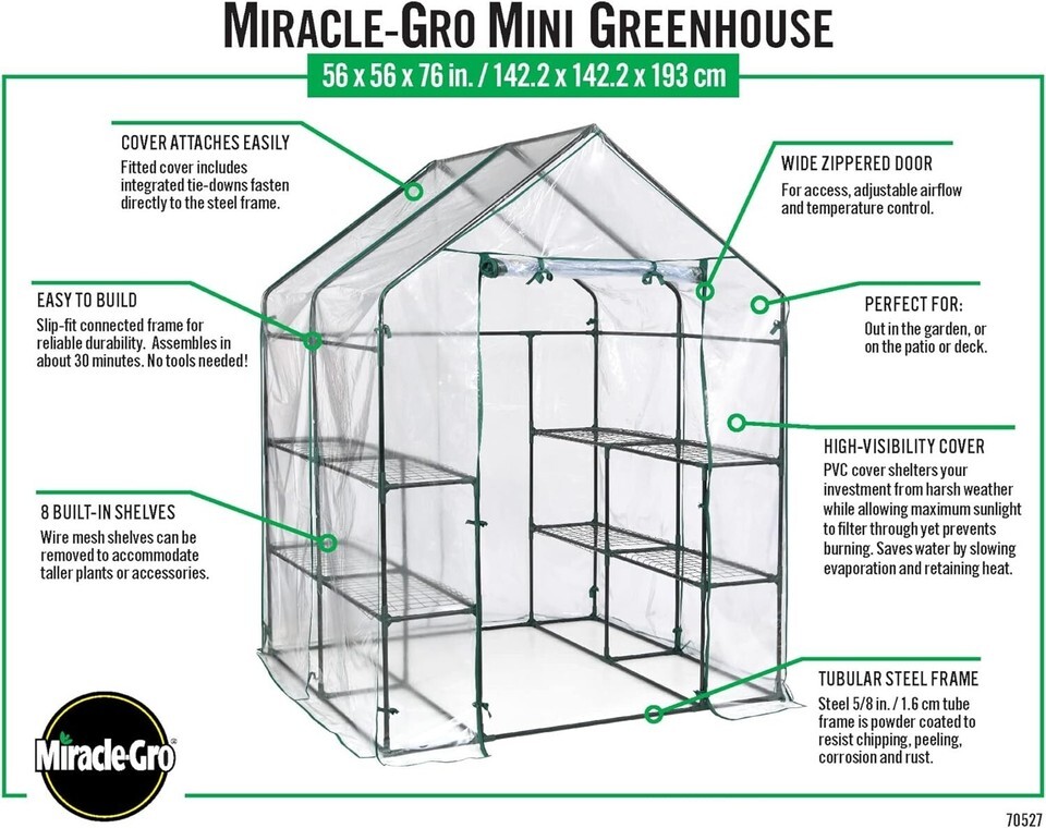 The Miracle-Gro Mini Greenhouse is a practical and durable addition to any gardener's toolkit. With its easy assembly, sturdy construction, and protective features, it's the perfect solution for year-round gardening in smaller spaces. Whether you're starting seedlings or protecting delicate plants, this greenhouse will help you create the ideal growing environment.