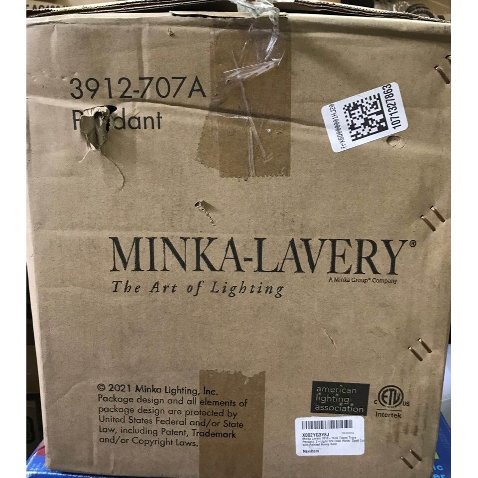 Open box and unused. Still in box see photos. Box may have some wear/tear Minka Lavery 3912-707A Titans Trace Pendant, 2-Light 120 Total Watts, Sand Coal with Painted Honey Gold 10" wide x 10" high. Round canopy is 5" diameter. 4.85 lbs. Includes 6 feet of wire. Minimum overall height is 20". Maximum overall height is 56". Sloped ceiling adaptable. Includes 3-12? and 1-6? downrods. Takes two 60 watt maximum E12 candelabra base bulbs (not included). Dimmable. Mid-century industrial Titans Trace mini-pendant light, from Minka Lavery. 2