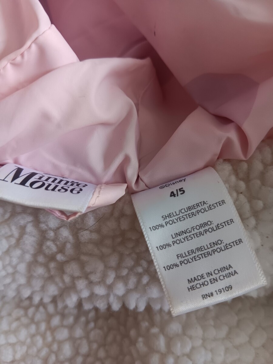 This Minnie Mouse winter coat, designed for girls aged 4-5, is a pink Disney-themed garment perfect for winter. With the iconic Minnie Mouse character design, this coat is not only stylish but also functional for keeping kids warm during colder weather. Made by Disney, this like-new coat is a must-have for any young girl who loves the beloved cartoon character.