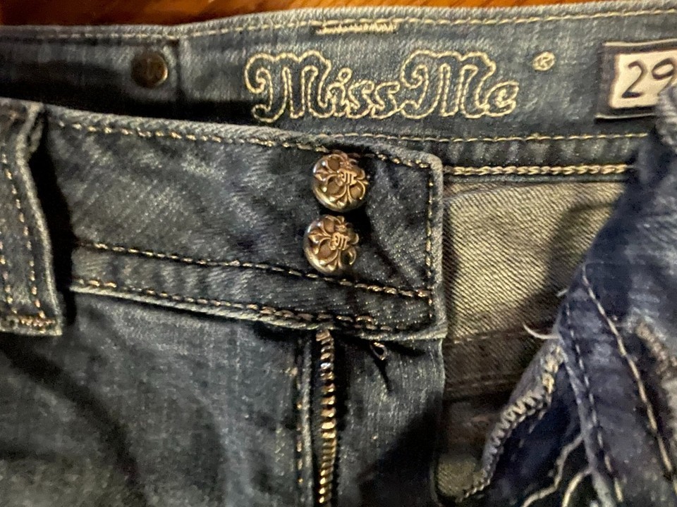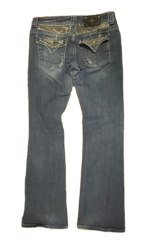 Miss Me Women's Jeans in a size 29 with a 35-inch inseam. These Bootcut style jeans feature rhinestone accents, a blue denim fabric, and a waist size of 29 inches. The style number is JP5002-43, and the jeans are sold by Country and Buckle.