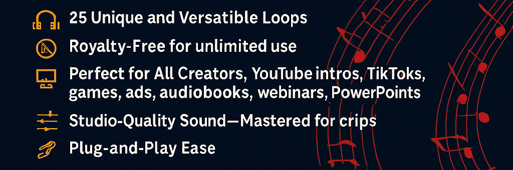 Ignite your creativity and transform your productions with Music Loops Pack 1, the ultimate audio toolkit for content creators, filmmakers, musicians, and entrepreneurs. Inside you’ll find 25 expertly-crafted, royalty-free music loops that instantly elevate any project with professional-grade sound.